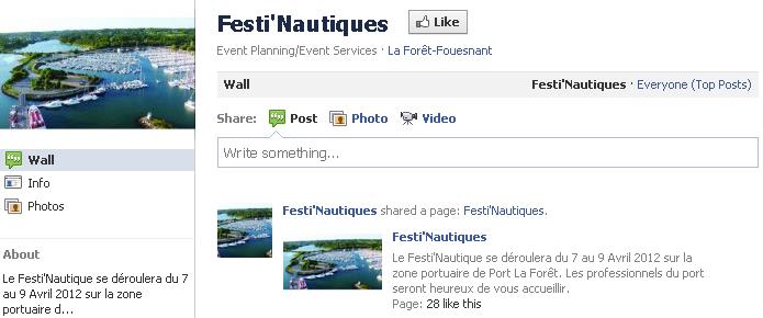 festinautiques sur facebookDans le cadre de leur projet tutoré, deux jeunes de l'INB (Julien Hereu et Pierre Guillemet) participent à l'organisation des Festi'Nautiques qui se dérouleront du 7 au 9 avril 2012 sur la zone portuaire de Port-la-Forêt.